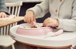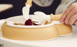 ベビービョルンのプレート・スプーン&フォークセットはかわいいだけだけではありません。 上手に楽しくお食事できるように設計されているスグレモノ。ベビーの「一人で食べたい」という自立心を優しくサポートします。