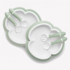 ベビープレートは、三つ葉のクローバー型をしており、お子様が簡単にスプーンやフォークで食べ物をすくえるようにな っています。プレートの縁まわりやテーブルの上であちこち食べ物を追いかける必要はありません。スプーンとフォーク は、プレートの形状に合うように特別に設計されており、左右どちらの手でも使用できます。スプーンとフォークの先端 はわずかに上がっており、口に食べ物を入れやすくなっています。